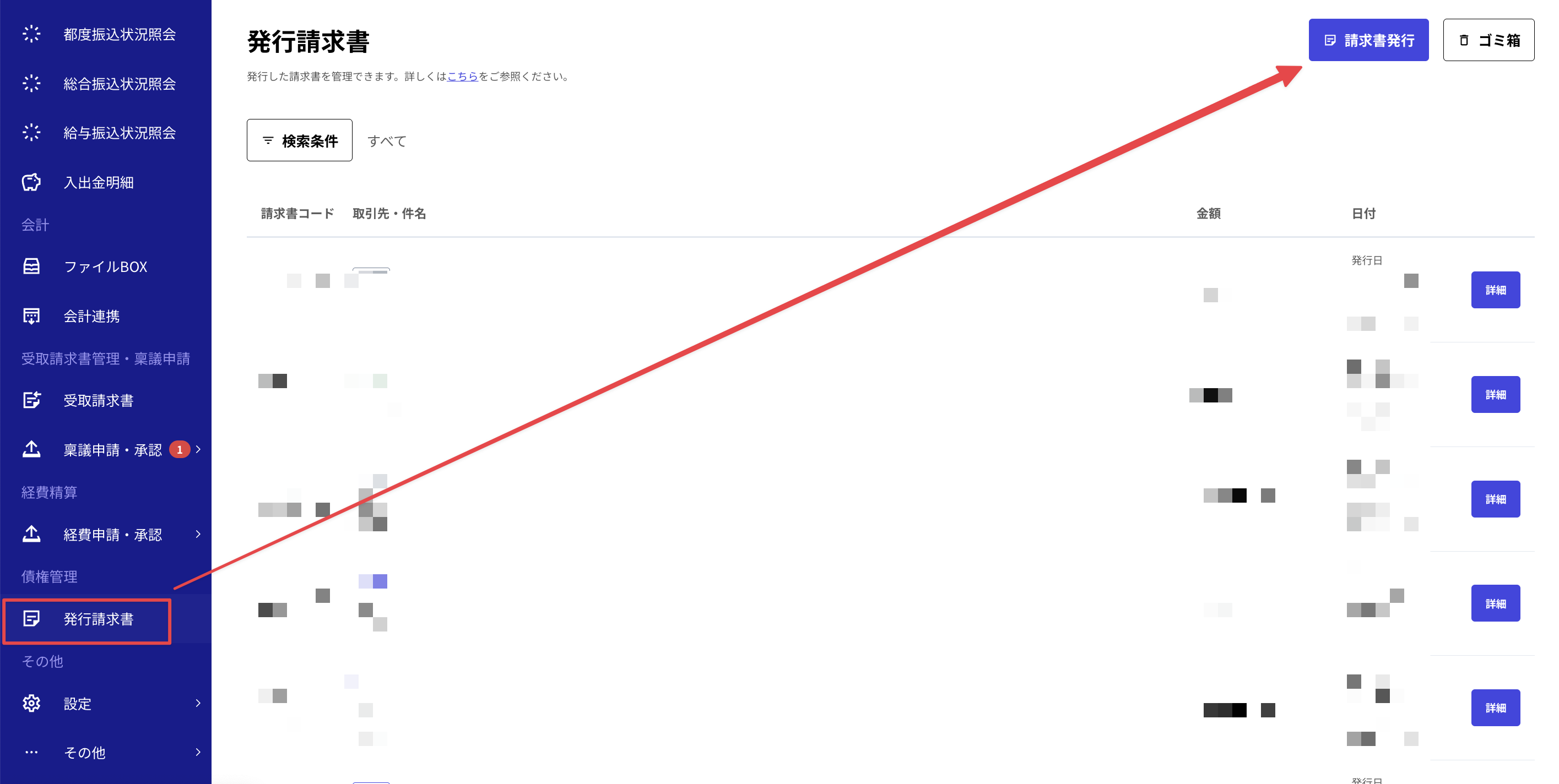 サイドメニューの「発行請求書」を選択し、「作成」を押下してください。