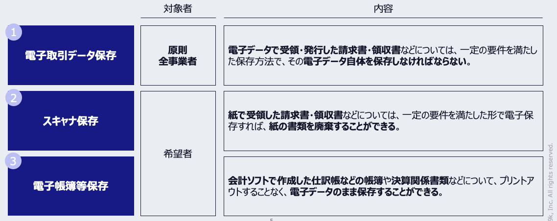 このうち①の電子取引データ保存については、原則として全事業者の対応が義務付けられています。具体的には、メールの添付ファイルなど、電子ファイルで受領・発行した請求書や領収書などについては、タイムスタンプを付与するなどの法律の要件を満たした方法で保存しなければなりません。