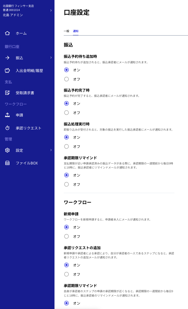 メールでの通知内容を変更する方法を教えて下さい。 振込のステータスやワークフローの承認状況などに応じて、メールで通知をすることができます。 サイドメニューの「設定」から「口座設定」を選択し、「通知」タブを開いて設定ください。