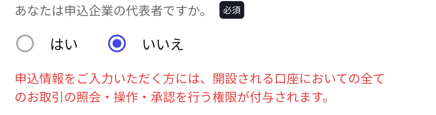 - 口座開設申込時に、申込企業の代表者かどうかを確認する項目があるので「いいえ」を選択します。