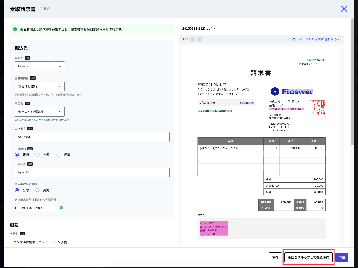 承認フローをスキップして振込を実行する方法を教えて下さい。 ①サイドメニュー受取請求書の「自分の申請」から、振込をしたい請求書をアップロードしてください。 ②入力内容の確認後、「承認をスキップして振込予約」を押下してください。 ③サイドメニュー「振込承認」から該当する案件を選択し、振込を実行してください。