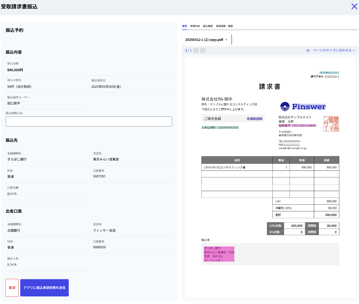 ⑫サイドメニューの「振込申請」タブを押下し、「申請承認済みの請求書の振込」を開きます。