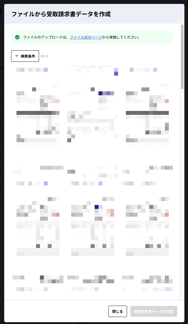④先ほどアップロードした請求書を選択し、右下の「受取請求書データを作成」をクリックします。