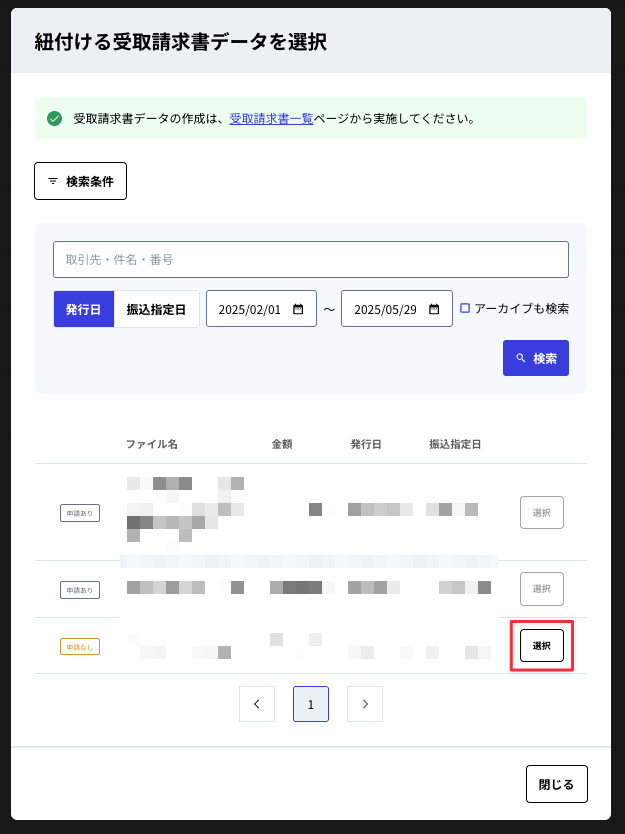 ⑧作成した請求書データのうち、振込を実施したい案件を選択してください。