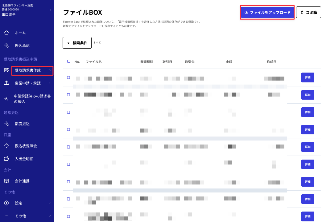 ①サイドメニューの「受取請求書作成」から「ファイルBOX」をクリックし、右上の「ファイルをアップロード」を選択します。
