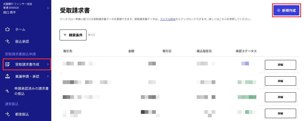 ③サイドメニューの「受取請求書作成」から「受取請求書」をクリックし、右上の「新規作成」を選択します。