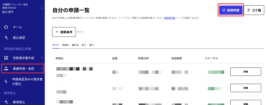 ⑥サイドメニューの「稟議申請・承認」から「自分の申請」をクリックし、右上の「新規申請」を選択します。