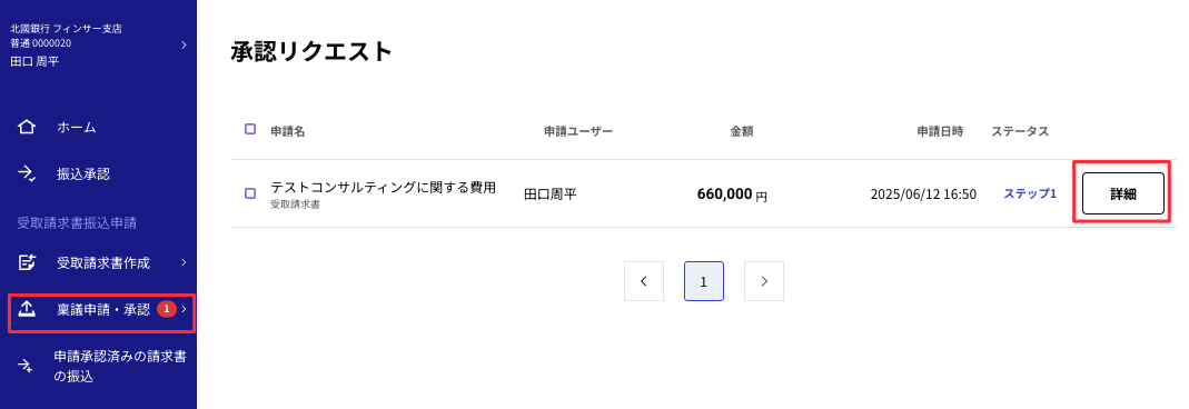 ⑪承認をする案件の「詳細」を開き、承認をしてください。