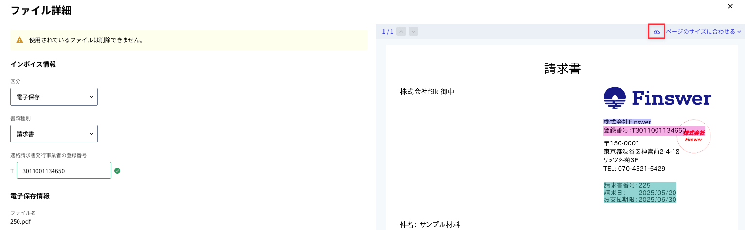 請求書データをダウンロードする方法を教えてください。 「ファイルBOX」や「受取請求書」等のファイル詳細画面から、赤枠で囲んであるダウンロードボタンを押下することで、ファイルをダウンロードすることができます。